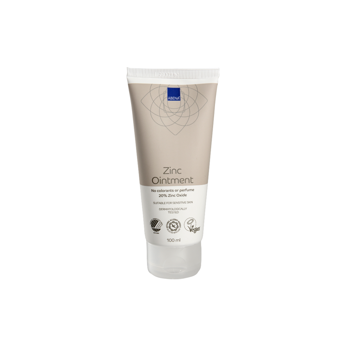 Abenas zinksalva (vatten-i-olja-emulsion) passar utmärkt för att skydda huden. Den innehåller 20% zinkoxid, känd för sina antiseptiska egenskaper, som lugnar irriterad och/eller röd hud.