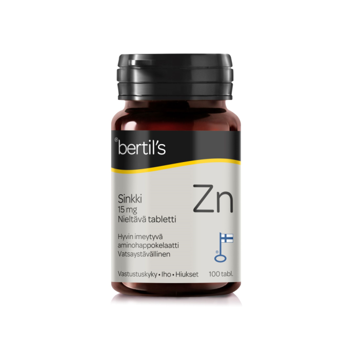 Kotimaiset bertil’s Sinkki -tabletit sisältävät aminohappokelatoitua sinkkiä.