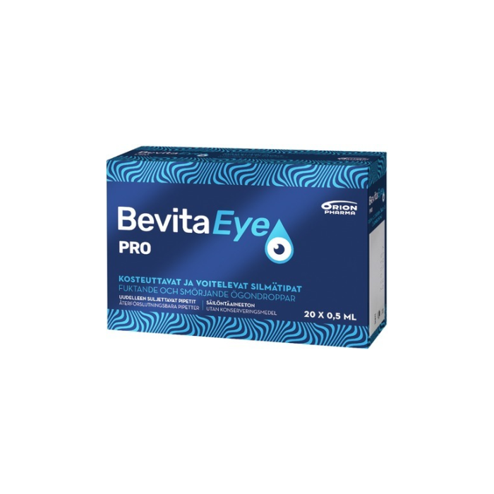 Bevita® Eye Pro Forte ögondroppar är återfuktande och smörjande ögondroppar som ger en långvarig lindring av olika symtom orsakade av torra ögon. Ögondropparna innehåller 0,4 % hyaluronsyra och 0,2 % TS-polysackarid. Hyaluronsyra skyddar och smörjer ögats yta. TS-polysackarid skyddar och balanserar tårfilmen. De synergistiska effekter som blandningen av dessa två ämnen har på ögats horn- och bindhinnor, ger ögonen ett långvarigt skydd mot den irritation som olika faktorer i omgivningen (vind, sol, rök, torr luft), olika stressmoment (alltför kraftigt ljus, långvarig användning av datorer) och olika mekaniska faktorer (användning av kontaktlinser, postoperativa tillstånd efter ögonoperationer) orsakar. Halterna av de olika ämnena i lösningen har valts så att dropparna förmår smörja ögonen också i samband med mycket kraftiga obehagssymtom.