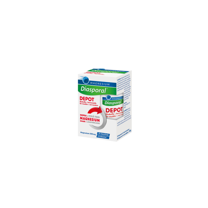 Diasporal® DEPOT on kaksivaiheinen tehoyhdistelmä magnesiumia sekä B-vitamiineja lihaksille sekä hermostolle. Magnesium edistää lihasten ja hermoston normaalia toimintaa. B-vitamiinit edistävät hermoston normaalin toiminnan lisäksi normaalia energia-aineenvaihduntaa. Patentoitu kaksivaiheinen tablettirakenne sisältää sekä nopeasti liukenevan että pitkäkestoisesti liukenevan kerroksen. Tabletista vapautuu nopeasti imeytymiseen magnesium sekä B2- ja B12-vitamiinit. Tabletin depot-osa vapauttaa magnesiumia sekä B1- ja B6-vitamiineja tasaisesti ja pitkäkestoisesti, usean tunnin ajan. Yksi tabletti päivässä riittää.