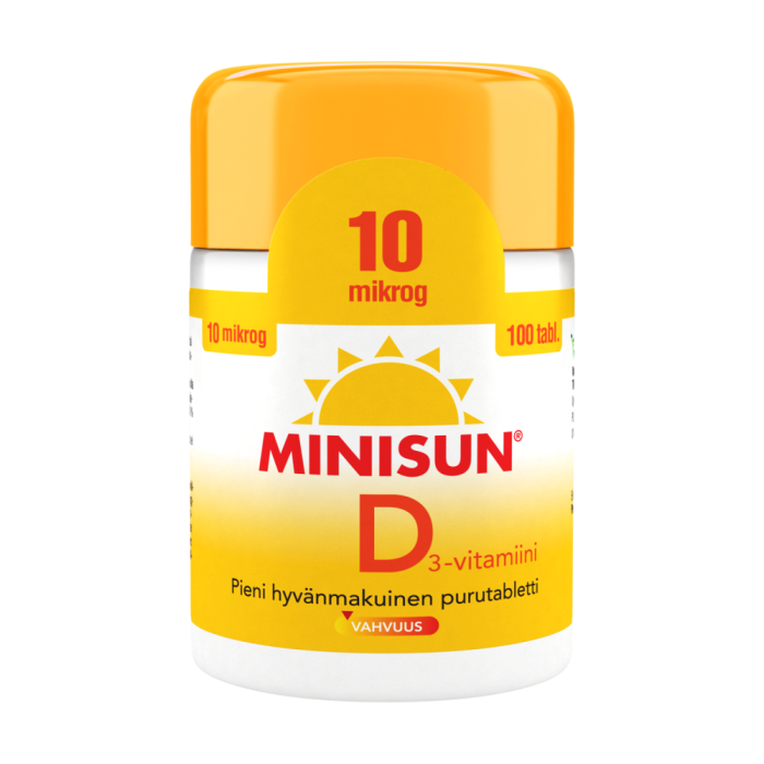 Minisun D-vitamintabletterna har utvecklats i Finland och lämpar sig för hela familjen. Minisun 10 mikrog tuggtabletter är en välsmakande favorit bland både vuxna och barn. Ett enkelt sätt att trygga det dagliga behovet av vitamin D året om. Minisun innehåller vitamin D3 som effektivt tas upp i kroppen. Vitamin D förstärker motståndskraften och är ett viktigt vitamin för välmående benstomme, muskler och tänder. Tabletterna är sötade med xylitol och de fungerar både som sug- och tuggtabletter, som vanliga tabletter att svälja, samt i krossat format. Produkten är fri från laktos, gluten, jäst, soja och gelatin.